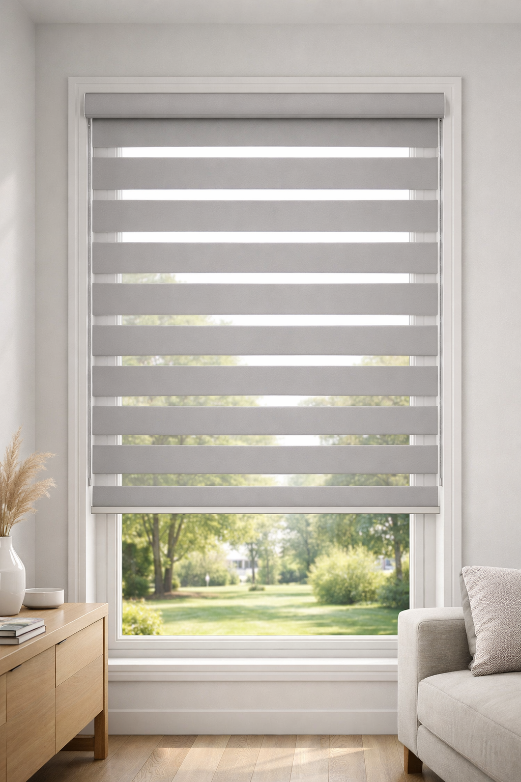 Beyond their distinctive style, zebra shades are engineered for performance. They help reduce glare, filter UV rays to protect interiors from fading, and maintain comfortable light levels throughout the day. The dual-layer design allows precise alignment for customizable visibility and privacy without fully raising the shade.